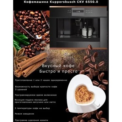Кофемашина Kuppersbusch CKV 6550.0 ЖК-дисплей с текстовым и графическим полями Электронная система управления с сенсорными кнопками Программируемое количество кофе для 5 размеров чашек (эспрессо, малая, средняя, большая, высокая) Приготовление 1 или 2 чашек Функция подачи молока для приготовления капучино или латте Съемный контейнер для молока с функцией очистки Возможность использования кофейных зерен или молотого кофе Регулируемый по высоте раздатчик кофе Давление при заваривании 15 бар 3 температуры кофе на выбор Возможность выбора крепости кофе (5 предварительно заданных уровней) Отдельные нагреватели для заваривания кофе и приготовления горячей воды Программа удаления накипи Автоматическое ополаскивание при включении и отключении Емкость для воды заполняется спереди Электронный таймер с белыми индикаторами Программируемое время включения Режим ожидания Телескопические направляющие для легкого заполнения кофемашиныПодсветка чашекНаблюдение доставляет удовольствие - хорошо известный факт. Светодиодная подсветка преподносит только что сваренный кофе в правильном свете. И приготовление кофе становится хорошей традициейЕмкость для свежей водыДуховые шкафы и кофемашины Kuppersbusch легко встраиваются в любую кухонную мебель, так как благодаря наличию емкости для свежей воды подсоединение к водопроводу не требуютсяХарактеристики:Потребляемая мощность: 1,35 кВт (вилка Schuko)Размеры прибора (Ш x В x Г): 595 x 455 x 475 мм (вкл. фасад 20 мм и телескопические направляющие) Размеры ниши (Ш x В x Г): 560 x 450 x 550 мм