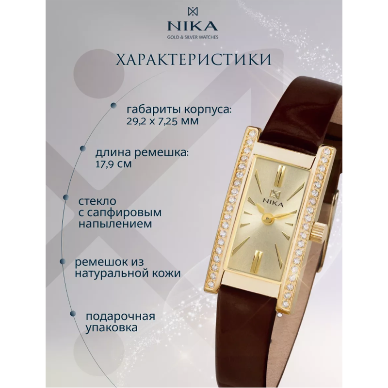 Женские часы из коллекции Lady обладают волевым характером и тонкой огранкой. Прямоугольный золотой корпус с двух сторон декорирован бриллиантами или фианитами. По периметру циферблата расположились золотистые метки. Эта модель, как и любая вечная классика, никогда не перестанет быть привлекательной! ХАРАКТЕРИСТИКИ: Средний вес драгметалла :Золото - 6,033 г Размер ушка: 10 Габаритный размер: 15,5 х 29,2 мм Габаритная высота: 7,25 мм Форма корпуса: прямоугольник Вставка: бриллианты Стекло: минеральное с сапфировым напылением Цвет циферблата: шампань Тип механизма: Кварцевый Механизм: Ronda 1032, ШВЕЙЦАРИЯ Функции: часы, минуты Материал ремешка: натуральная кожа Водостойкость: 1АТМ Элемент питания: 317 (SR516SW)