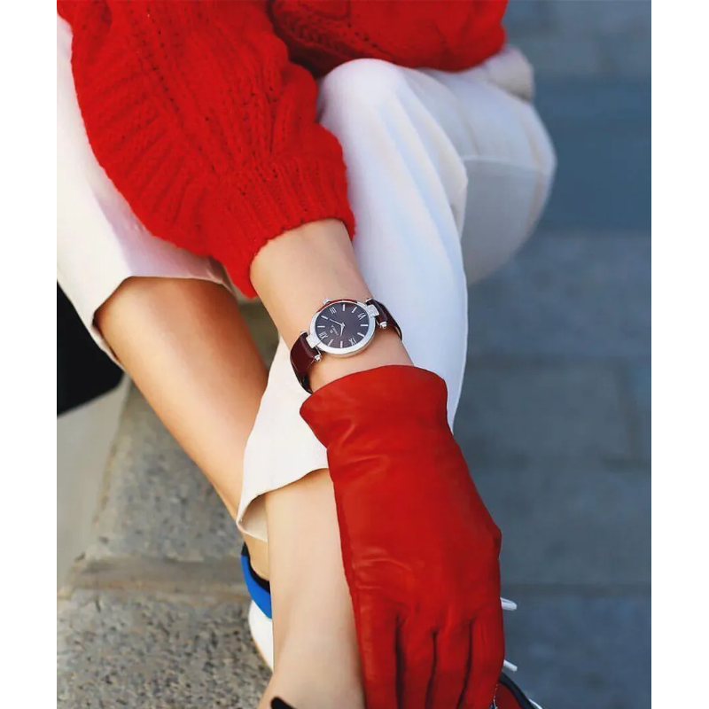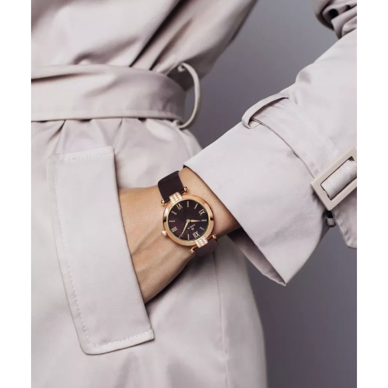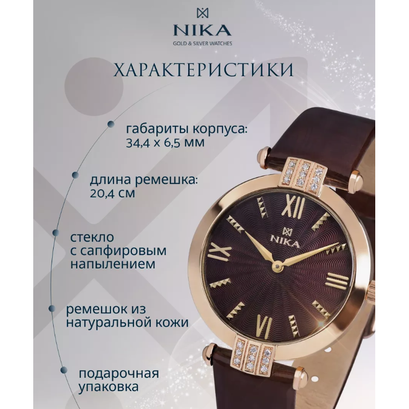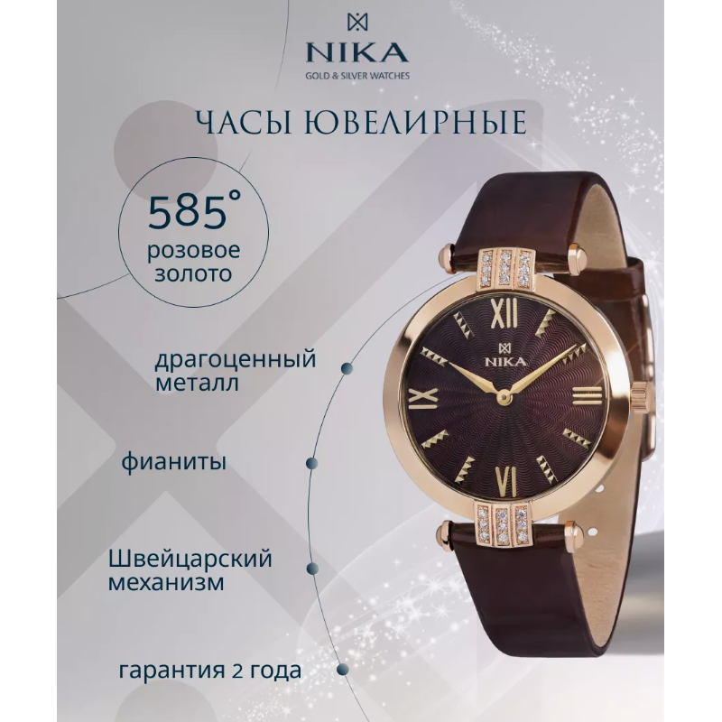 Тонкий корпус в женских золотых часах – один из самых популярных европейских трендов. Особого внимания заслуживает оригинальный дизайн ушек с тремя стройными рядами фианитов. Гильошированные циферблаты с фактурными накладными индексами представлены в трех цветах: классическом черном, благородном коричневом и элегантном золотистом. Обратите внимание: внутренняя сторона бежевого ремня украшена фирменным паттерном. ХАРАКТЕРИСТИКИ: Средний вес драгметалла: Золото - 12,336 г Размер ушка: 16 Габаритный размер: ø 34,4 мм Габаритная высота: 6,5 мм Форма корпуса: круг Вставка: Фианиты (ø 1,2 х 18 шт) Стекло: минеральное с сапфировым напылением Цвет циферблата: бордовый Тип механизма: кварцевый Механизм: RONDA 1062, ШВЕЙЦАРИЯ Функции: часы, минуты Материал ремешка: натуральная кожа Водостойкость: 1АТМ Элемент питания: 321 (SR616SW)
