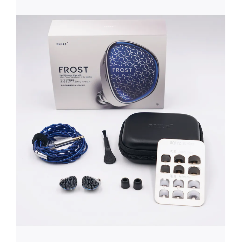 Спецификация: Гибридные наушники с динамическим и микропланарным драйвером. 1.Наименование: BQEYZ FROST 2.Блок драйвера: динамический драйвер + микропланарный драйвер 3.Динамический драйвер: 10 мм 4.Импеданс: 32 Ом 5.Чувствительность: 113 дБ 6.Частота: 5-40 кГц 7.Длина кабеля: 1,2 м 8.Тип контакта: 0,78 мм-2 контакта 9.Тип штекера: 3,5 мм или 4,4 мм 10.Диафрагма: композитная диафрагма PU и PEEK. 11.Спецификация кабеля: Посеребренный коаксиальный смешанный кабель 12.Содержимое: наушники*1 комплект, кабель * 1 шт., чехол для переноски*1 шт., кисть * 1 шт., силиконовые насадки для ушей (S/M/L) *6 пар, пена с эффектом памяти S*1 Наушники гибридного типа, использующие технологию микропланарного драйвера, в сочетании с динамическим драйвером Frost, обеспечивают превосходное звучание в среднем и высоком частотном диапазоне. Благодаря этому достигается кристальная чистота и естественность звучания в среднем и высоком регистрах, при сохранении глубокого и мощного баса. Новый дизайн передней панели BQEYZ FROST. Благодаря сочетанию прозрачного хрустального стекла и холодного синего цвета, поверхность приобретает изысканный блеск при попадании света под разными углами. Рисунок, напоминающий морозные узоры, словно оживает на этой прозрачной поверхности. BQEYZ FROST обладает естественной чистотой и сбалансированностью. Команда инженеров BQEYZ провела тщательный анализ характеристик устройства, а также изучила отзывы авторитетных и опытных аудиофилов. Были проведены многосторонние испытания, учитывающие индивидуальный опыт прослушивания. FROST — это устройство, которое поможет вам наслаждаться качественным звуком в домашних условиях. Благодаря сбалансированному звуку, оно станет вашим верным спутником в повседневных делах. Монокристаллический медный посеребренный коаксиальный кабель Монокристаллические медные провода размером 0,04 x 32, бескислородная медь 0,05 x 20 (внутренний вал), посеребренные провода 0,06 x 38 (внешнее кольцо) * Внешняя оболочка 2,3 мм.