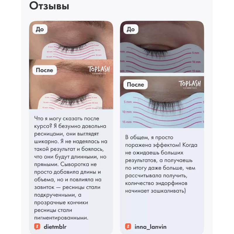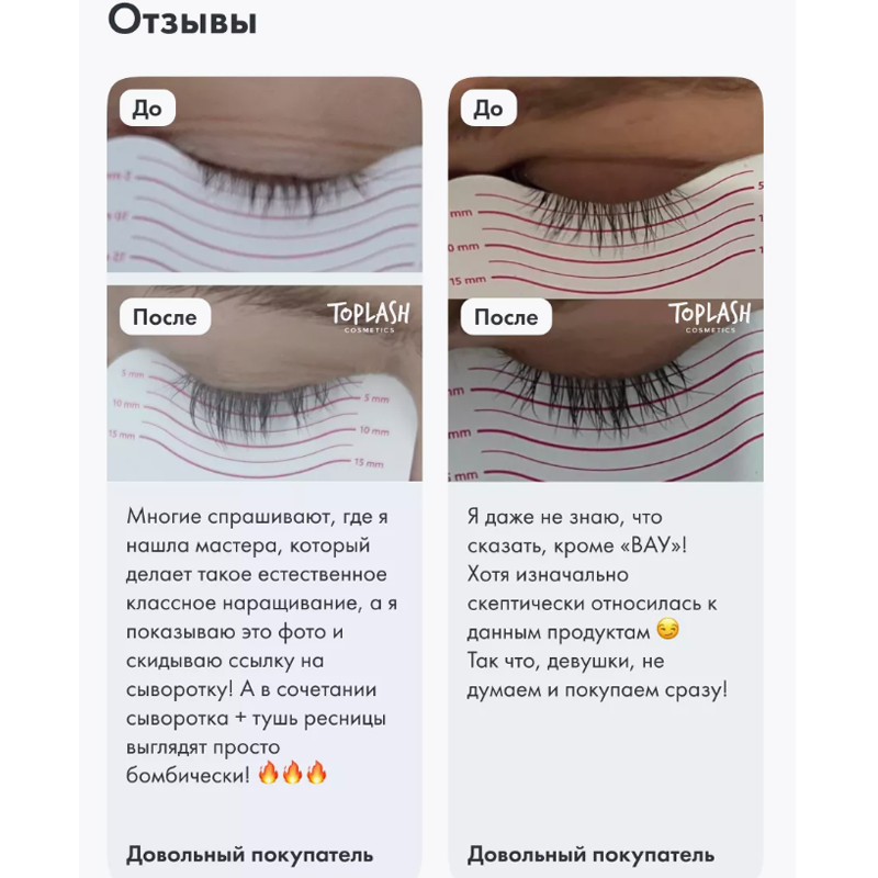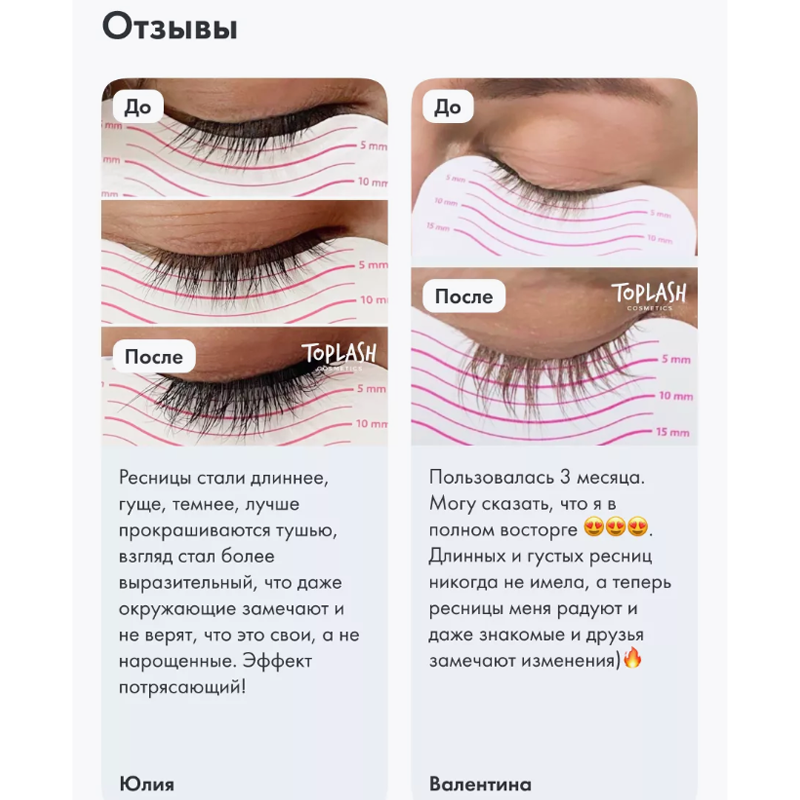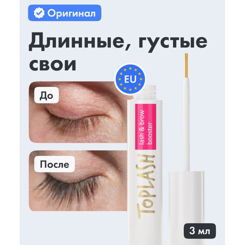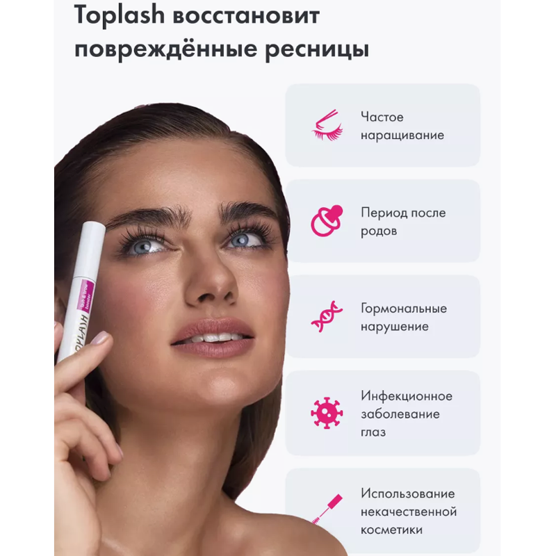 Toplash Lash and Brow - улучшенное средство для роста ресниц и линейка для бровей. Сыворотка для роста волос - это инновационное средство учитывает специфику регенеративных процессов волосков, благодаря чему быстро обеспечивает усиленный рост ресниц и бровей, делая их максимально длинными и густыми, а также надежно защищает от внешних факторов. Разработанный стимулятор роста предназначен для ухода за бровями и ресницами. Он обеспечивает максимально активный и быстрый рост волос, укрепление толщины, восстановление, питание и усиление естественного цвета. Самые первые результаты от ухода Toplash проявляются всего за 21 день использования. Согласно нашей статистике, при ежедневном нанесении Top средство увеличивает длину волосков на 52,3%, объем - на 31,9% lash, а также делает их сильнее на 30,6%, препятствуя раннему выпадению. Продукт по уходу за кожей лица, для глаз и бровей может использоваться после различных заболеваний, наращивания, применения некачественной косметики, и даже в послеродовой период, при потере качества и объема ресниц из-за дефицита полезных веществ в организме.