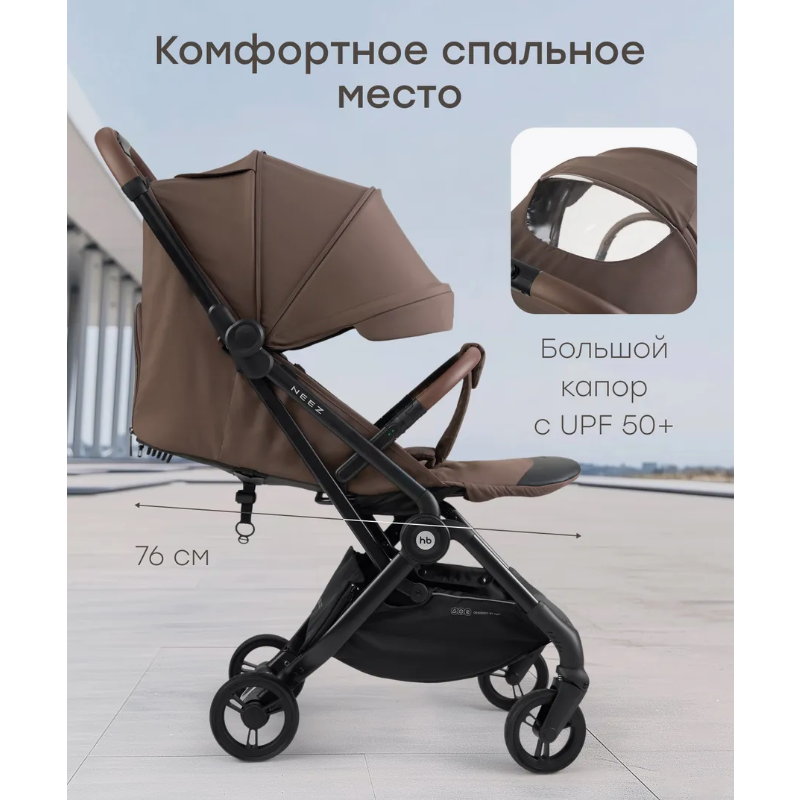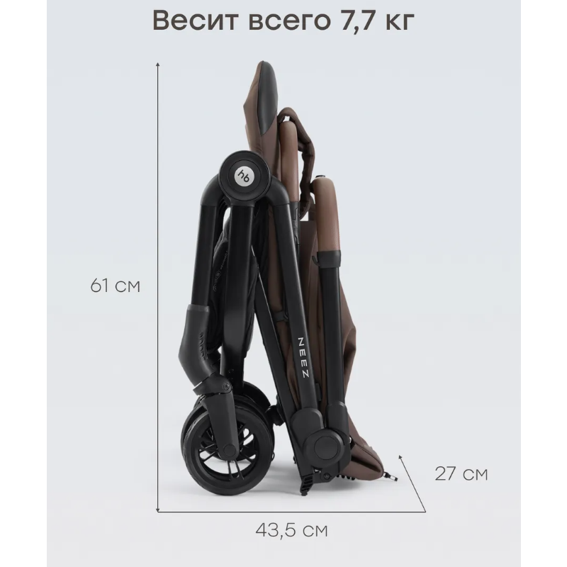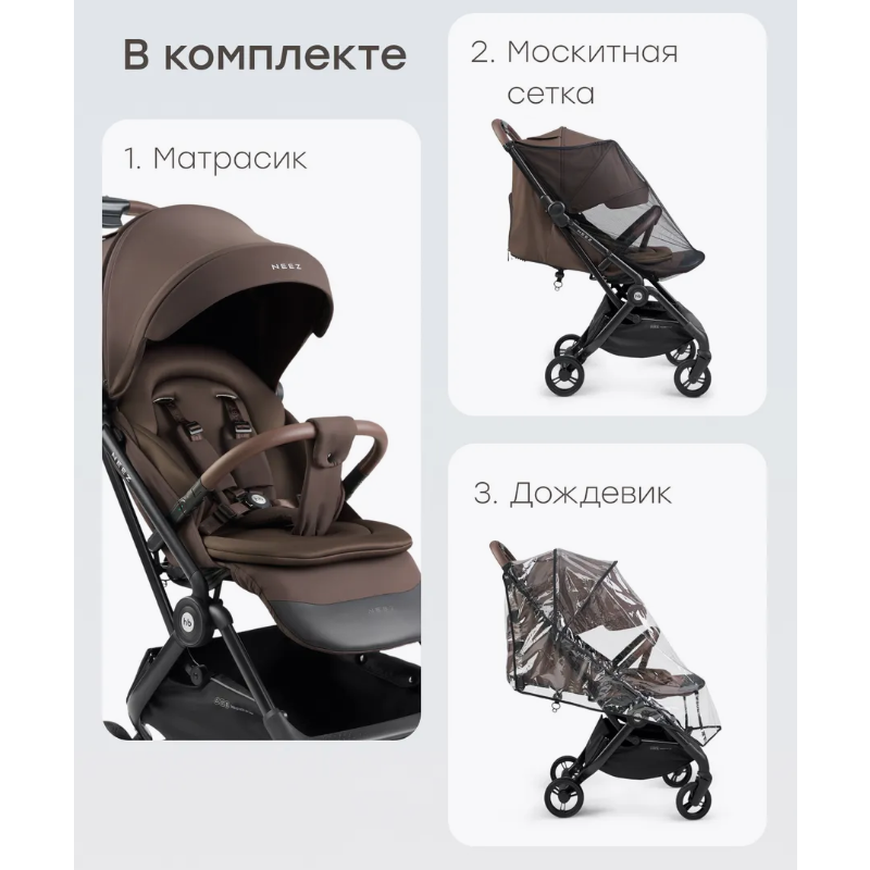 Коляска прогулочная NEEZ — идеальный выбор для активных родителей, которые ценят комфорт, стиль и функциональность. Компактные размеры и небольшой вес делают ее незаменимой для прогулок по городу и путешествий. С прекрасным управлением и функцией складывания одной рукой NEEZ обеспечит максимальное удобство в любых условиях. Регулируемая ремнем спинка позволит легко создать комфортное положение для сна или активного бодрствования малыша. Капюшон, расширяющийся до бампера, оборудован смотровым окошком, а вентиляционное окно на молнии с сеточкой подарит комфорт даже в самые жаркие дни. Карман для мелочей и корзина для покупок с допустимой нагрузкой до 4 кг сделают каждую прогулку еще практичнее. Для безопасности малыша предусмотрены пятиточечные ремни с магнитной пряжкой и откидной бампер. Каждая деталь продумана до мелочей. Коляска NEEZ — это сочетание маневренности, надежности и современного дизайна для вашего удобства и счастья вашего малыша. • Небольшой вес и компактные размеры • Колеса вращаются на 360 градусов • Маневренность, управление, складывание одной рукой • Регулировка наклона спинки ремнем • Капюшон до бампера с окном для удобства наблюдения за ребенком • Вентиляционное окно на молнии с сеточкой для вентиляции в жаркие дни • Карман для мелочей на молнии • Вместительная корзина для покупок на 4 кг • Безопасность: откидной съемный бампер, магнитная пряжка на пятиточечных ремнях безопасности с мягкими накладками, стояночный тормоз блокирует оба задних колеса • Комплектация: дождевик, москитная сетка, матрасик